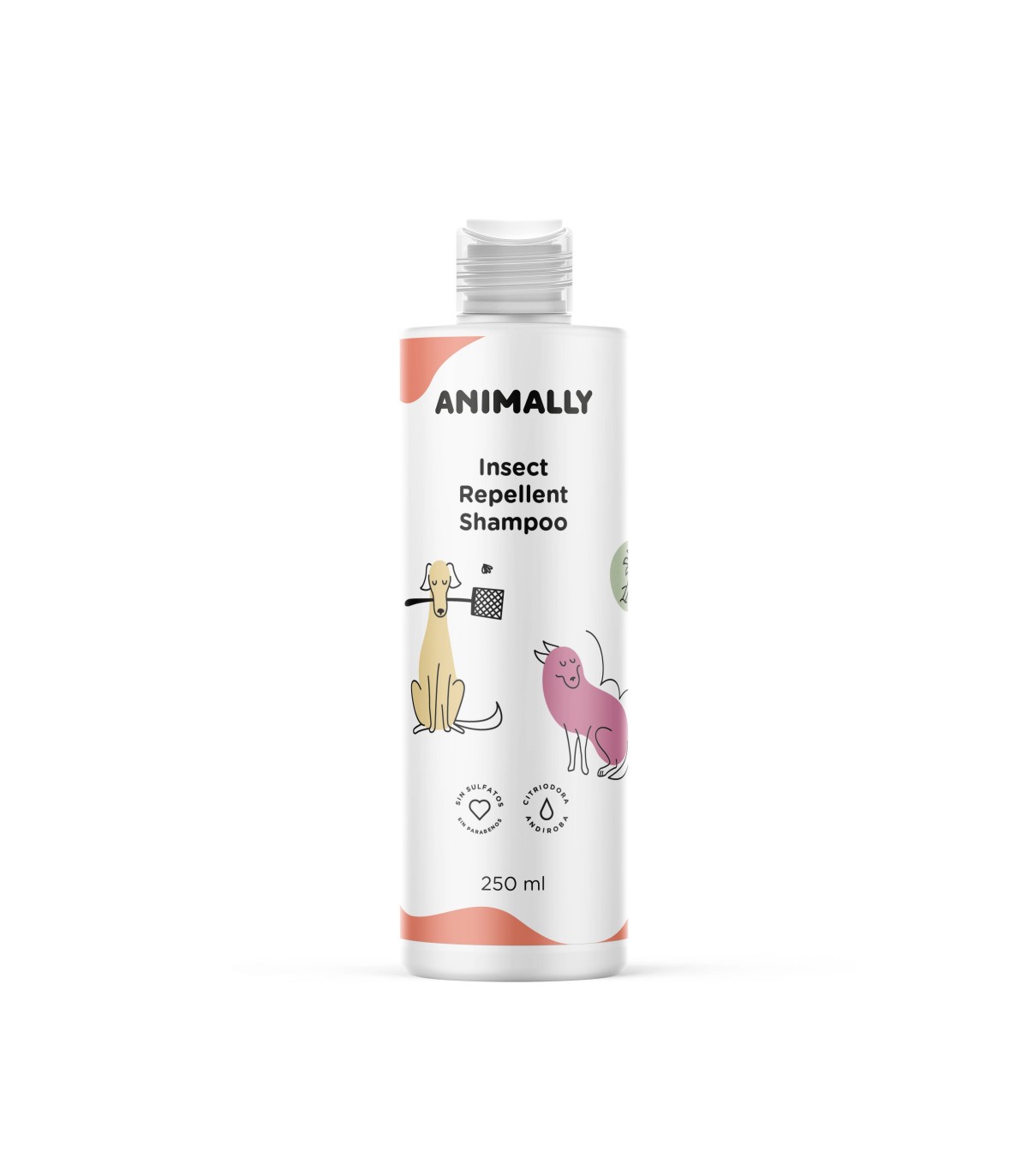 ANIMALLY Insect Repellent es un champú para cachorros o perros adultos con efecto repelente de pulgas, garrapatas y mosquitos gracias al aceite esencial de eucalipto citriodora y aceite de andiroba.