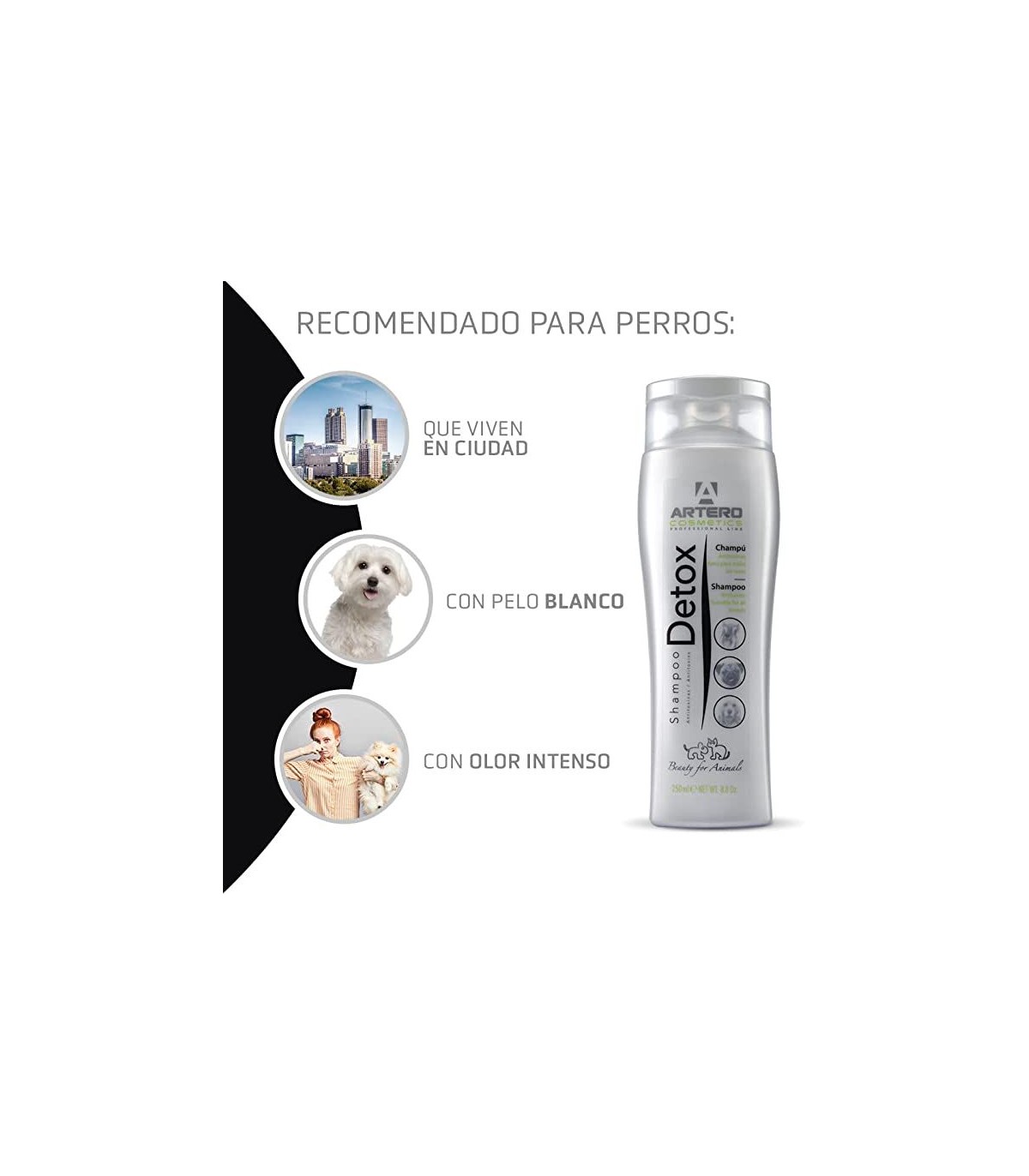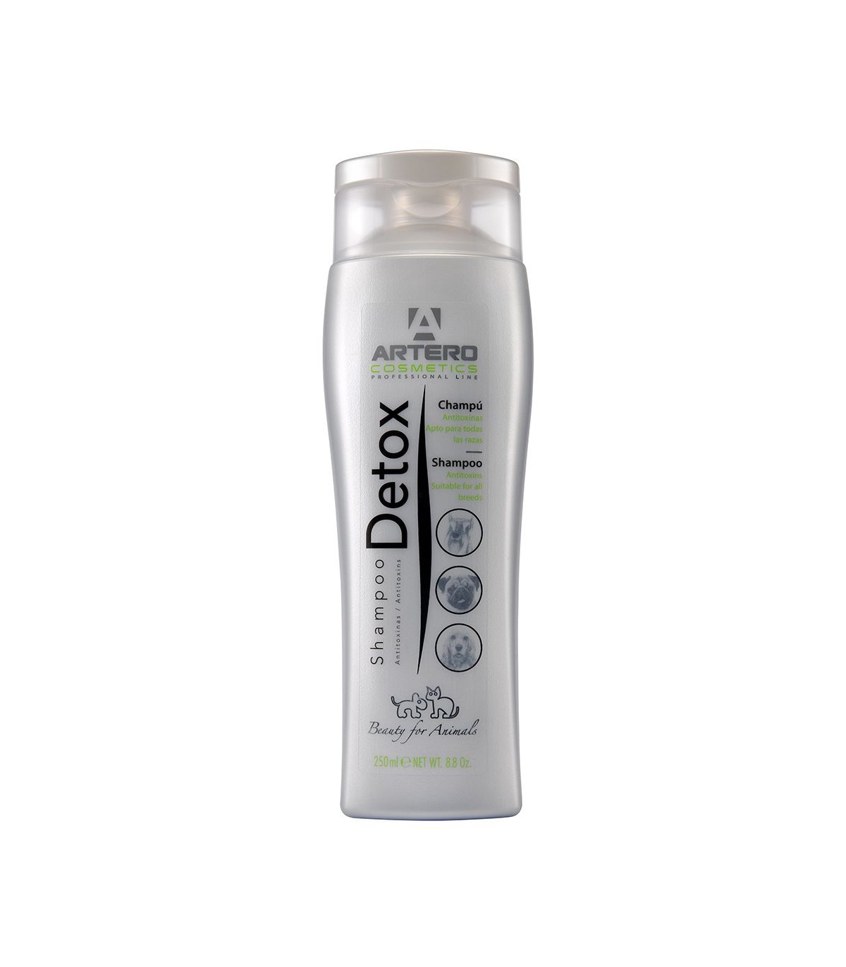 El Champú de ARTERO Detox con carbón activo, es un champú reparador, anti polución y con efecto desengrasante, ideal para perros de ciudad.