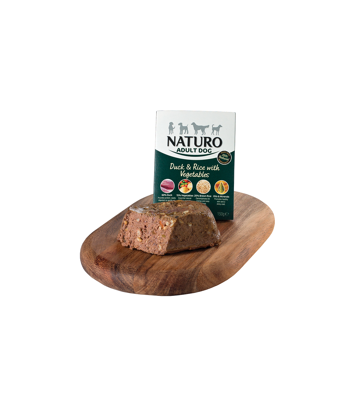 Las tarrinas de NATURO para perros de pato y arroz con verduras es alimento húmedo para perros adultos de cualquier raza o tamaño.