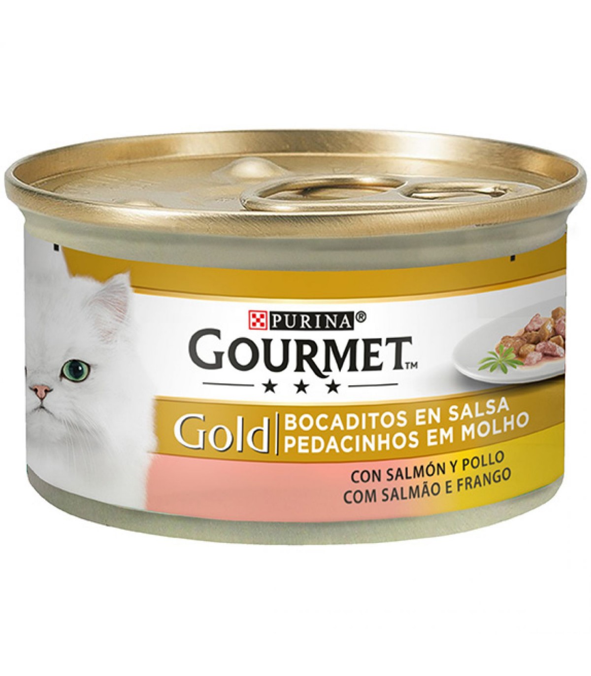 Gourmet Gold Bocaditos de Salmon y Pollo es alimentación húmeda para gatos que les encanta por su exquisito sabor.