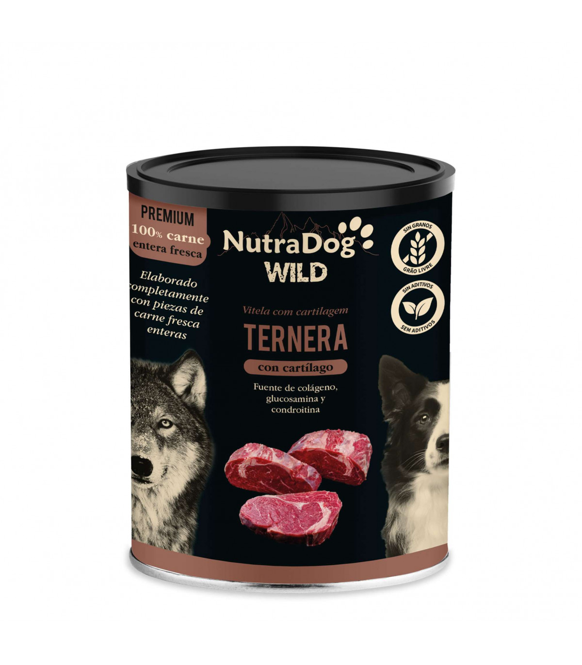 NutraDog Ternera es un alimento húmedo para perros 100% natural, compuesto por piezas enteras de ternera con su cartílago natural, sin aditivos ni ningún otro ingrediente.