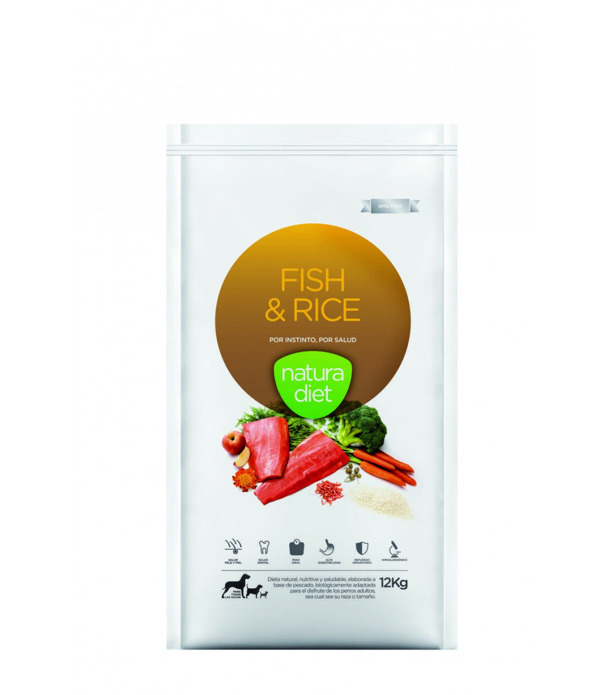 Natura Diet Fish & Rice es un alimento elaborado con ingredientes de origen totalmente natural, cuya principal fuente de proteína es el salmón.