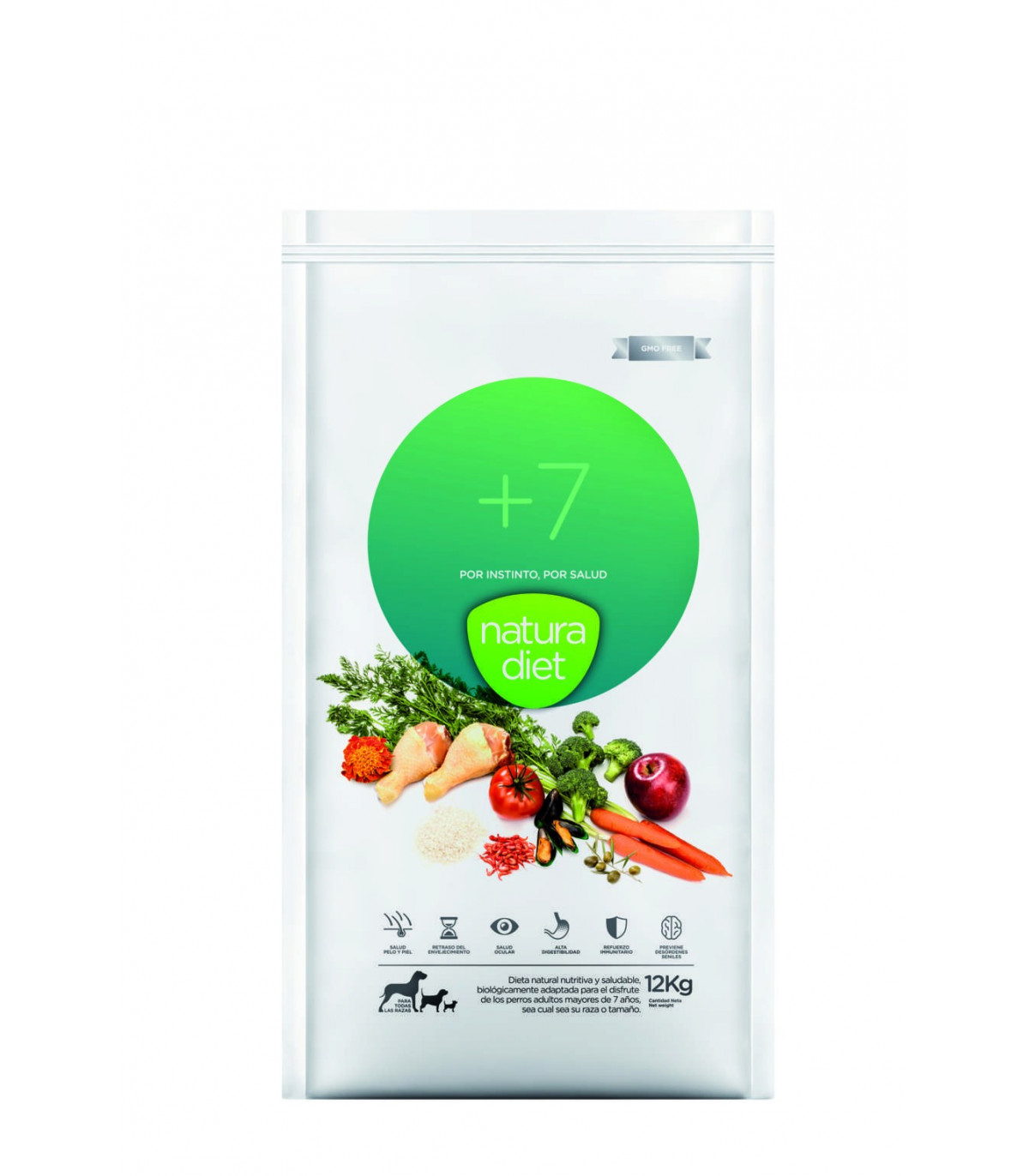 Natura Diet +7 suple las deficiencias anteriores debidas a alimentos de baja calidad, protege su sistema enzimático y osteoarticular, ralentiza sus desordenes seniles, cuida la flora intestinal y aporta los ácidos grasos esenciales que el animal no ya no es capaz de generar.