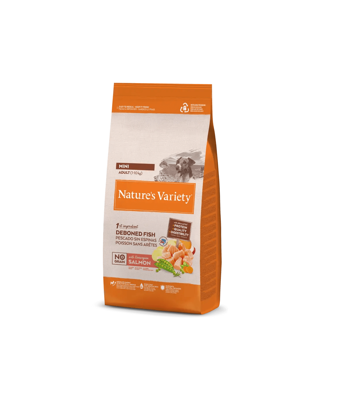 NATURE´S VARIETY NO GRAIN SALMON MINI es un alimento completo y equilibrado para perros adultos de tamaño mini, sin cereales y elaborado con salmón noruego deshuesado como ingrediente principal
