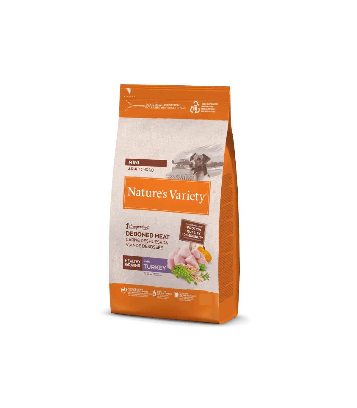 NATURE´S VARIETY HEALTHY GRAIN PAVO MINI es un alimento completo y equilibrado para perros adultos de tamaño mini y elaborado con carne de pavo deshuesada como ingrediente principal. Combinado con frutas y verduras cuidadosamente seleccionadas y cereales saludables.