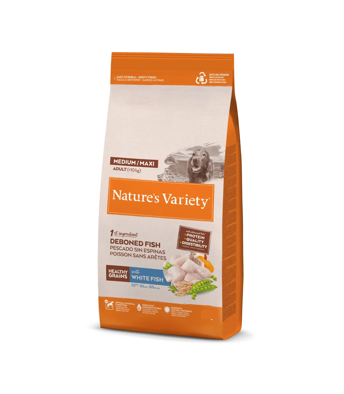 NATURE´S VARIETY HEALTHY GRAIN PESCADO BLANCO MEDIUM es un alimento completo y equilibrado para perros adultos de tamaño mediano o grande y elaborado con pescado blanco desespinado como ingrediente principal. Acompañado de frutas y verduras cuidadosamente seleccionadas y cereales saludables.