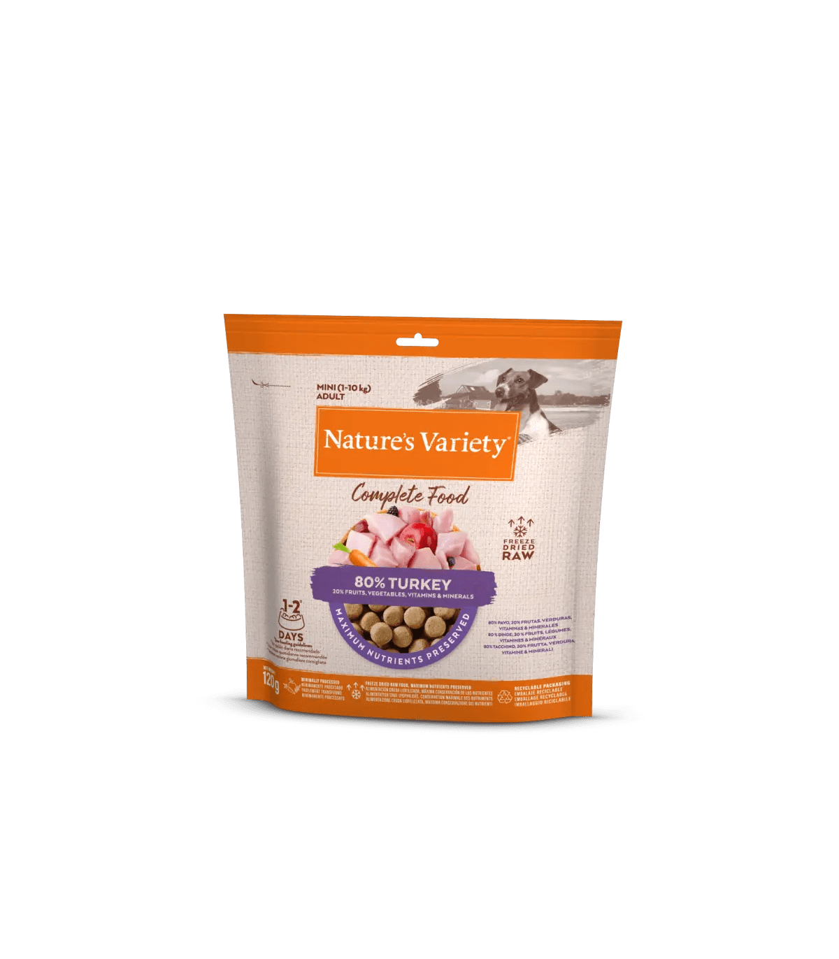 NATURE´S VARIETY COMPLET FOOD Pavo es un alimento completo y balanceado para perros adultos ,elaborado con ingredientes 100 % naturales, con vitaminas y minerales añadidos. Liofilizado para una máxima conservación de nutrientes.