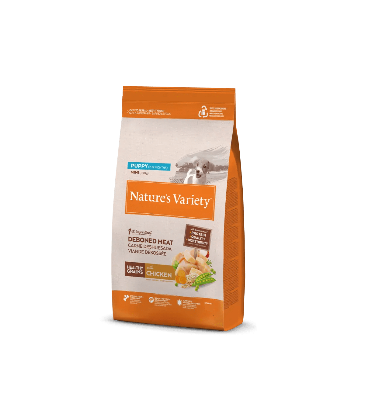 NATURE´S VARIETY PUPPY NO GRAIN SALMON MINI Alimento completo y equilibrado para cachorros de tamaño mini, sin cereales. Elaborado con salmón noruego deshuesado como ingrediente principal. Combinado con frutas, verduras, superalimentos y fuentes naturales de carbohidratos alternativos.