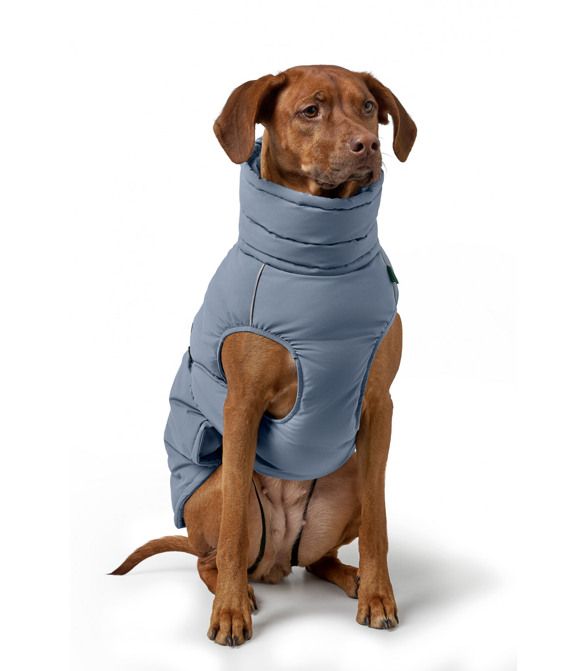 Incluye cuello alto ajustable, correa abdominal elástica y ajustable, tiradores traseros para las patas y una práctica abertura para enganchar la correa al collar o arnés.