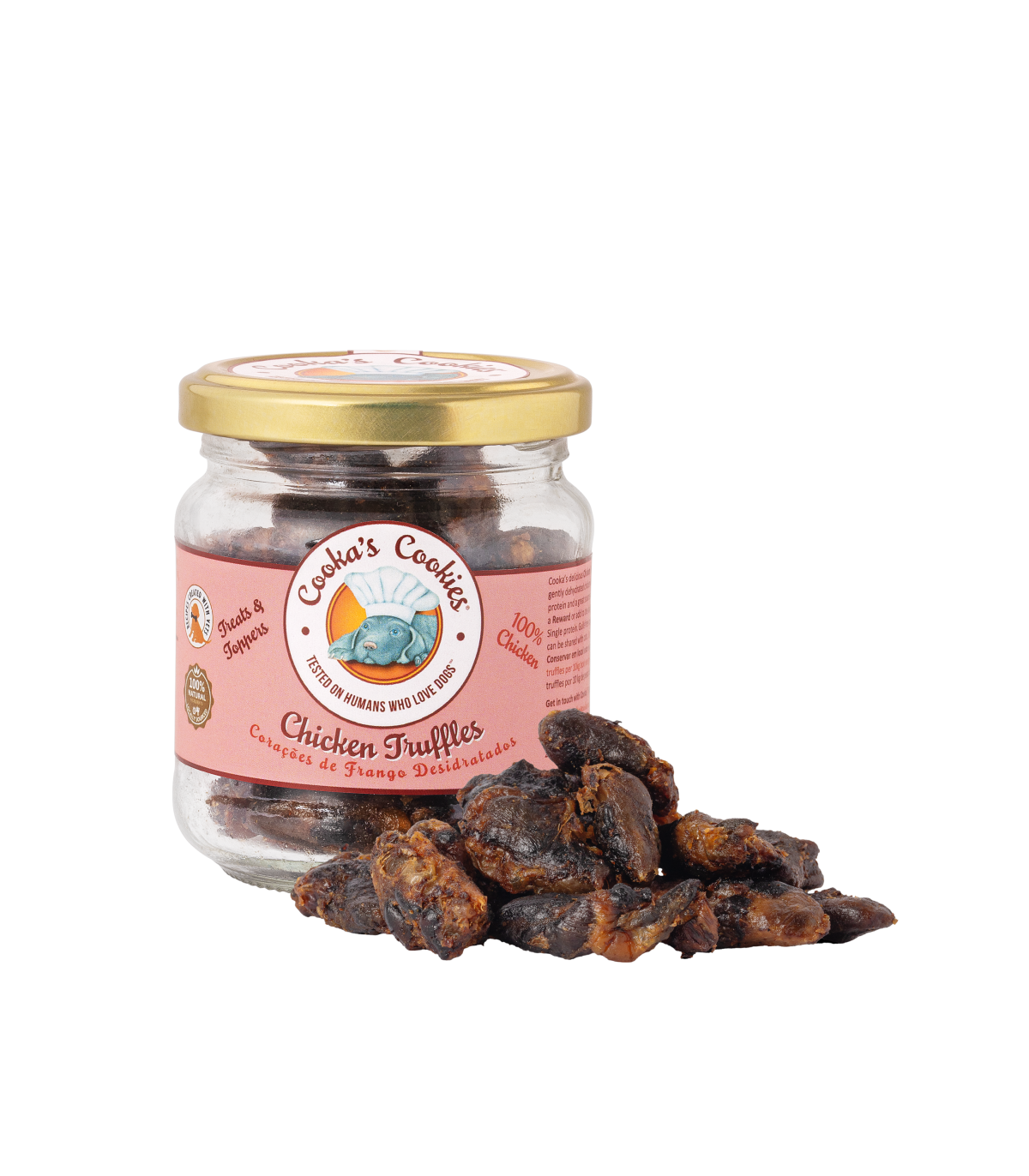 Los Corazones de Pollo de Cookas Cookies vienen presentadas en un tarro de cristal, los corazones de pollo es un snack monoproteico y 100% natural, sólo pollo y nada más (ni aditivos, ni conservantes, ni cereales) y son aptas tanto para perros como para gatos.