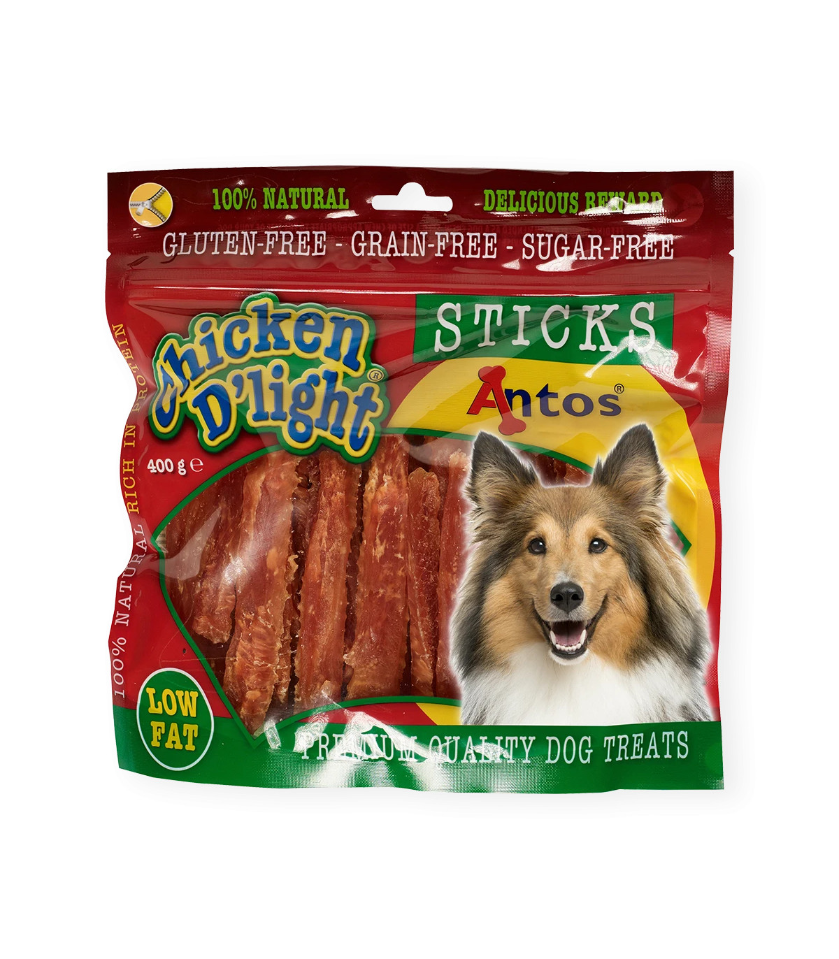 Chicken D´Light Stick de ANTOS son deliciosas tiras de pechuga de pollo tostada sin aditivos.